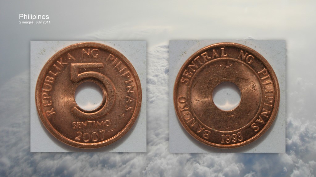 The five sentimo coin is currently the second-lowest denomination coin of the Philippine piso after the one sentimo. It is identical in its dimensions to the one sentimo coin, thus it features a hole through its middle.